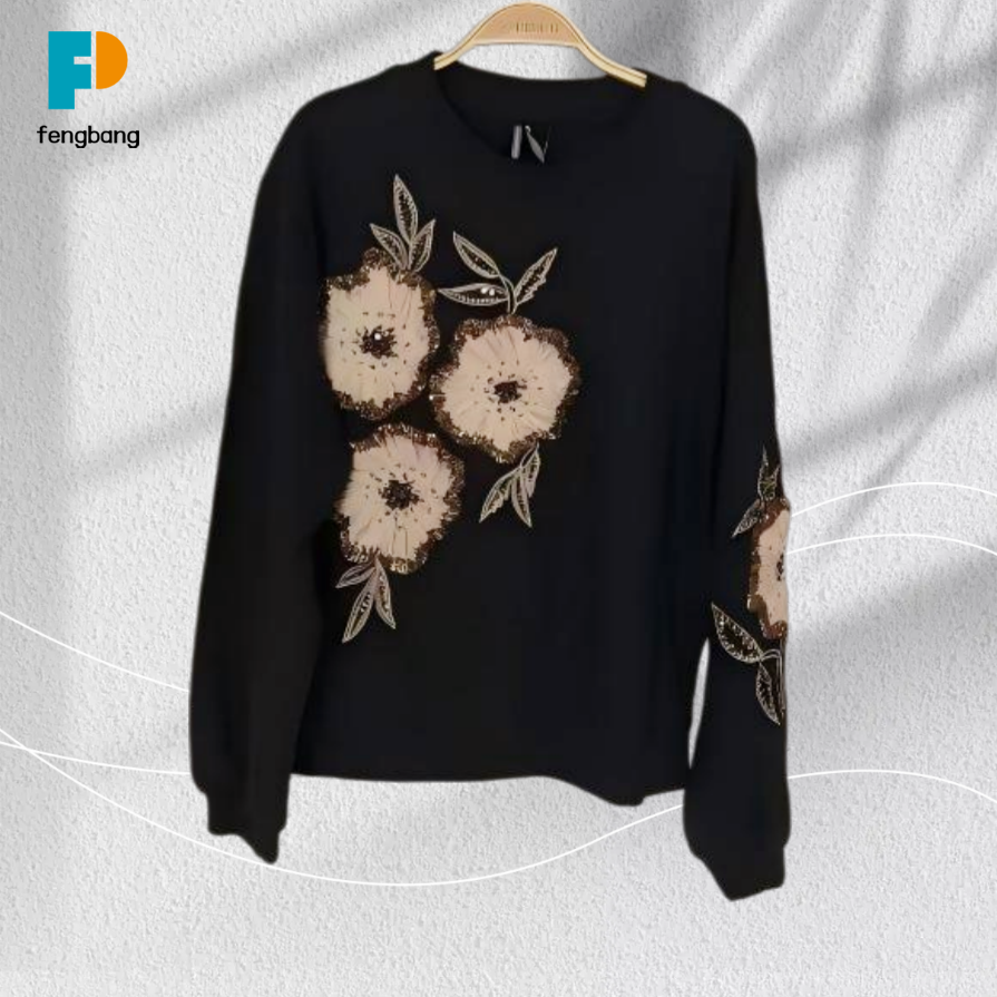 Siyah Yün Kazak Üzerine El Yapımı Çiçek Nakış